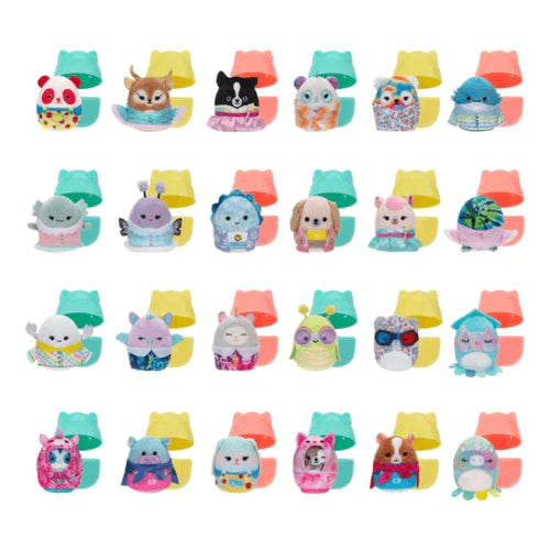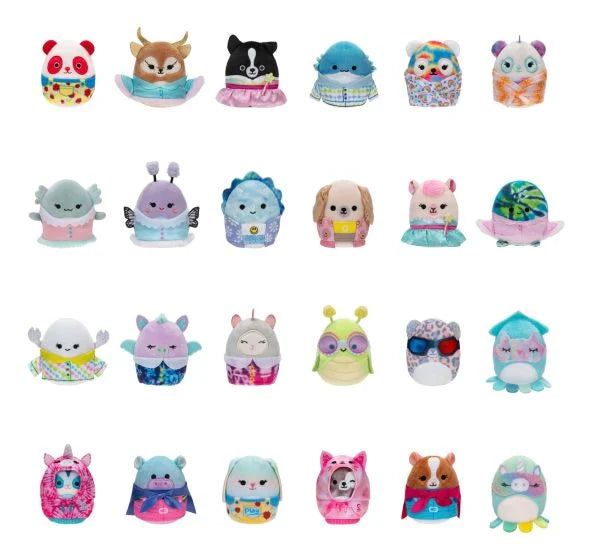 Get ready for the adventure of a lifetime with the Squishville Blind Plush, featuring your favorite Squishmallows in an adorable 2-inch size. Each Squishville Cam-tastic collectible egg features one 2-inch Squishmallows and one fun fashion accessory they can squeeze into. Build your Squad and mix and match fashions with these blind 2-inch Squishmallows! In the World of Squishville, everything is made of super soft materials, including playsets, accessories, fashions, and your 2” Squishmallows. There are 24 different Squishmallows and fashions to collect in Series 12, such as Ensley the Llamacorn, Jemima the tie-dye Panda, Pilar the Grasshopper, Wu the Bunny, and many more!